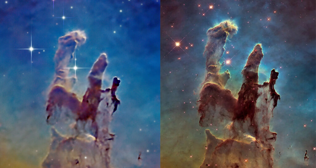 Fig. 1—Left: Dr. Leyendecker’s reproduction of the “Pillars of Creation” from the M16 Eagle Nebula…with just an 8-inch diameter backyard telescope! Right: Those same towering tendrils of cosmic dust and gas, care of the Hubble Space Telescope (courtesy of NASA, ESA, and Hubble Heritage Team.)