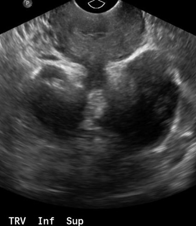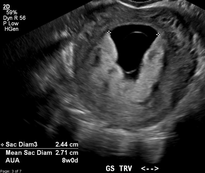 Fig. 4—Example of definite early pregnancy loss (EPL) with intrauterine gestational sac with mean sac diameter of 27 mm and no visible embryo (courtesy of SRU)