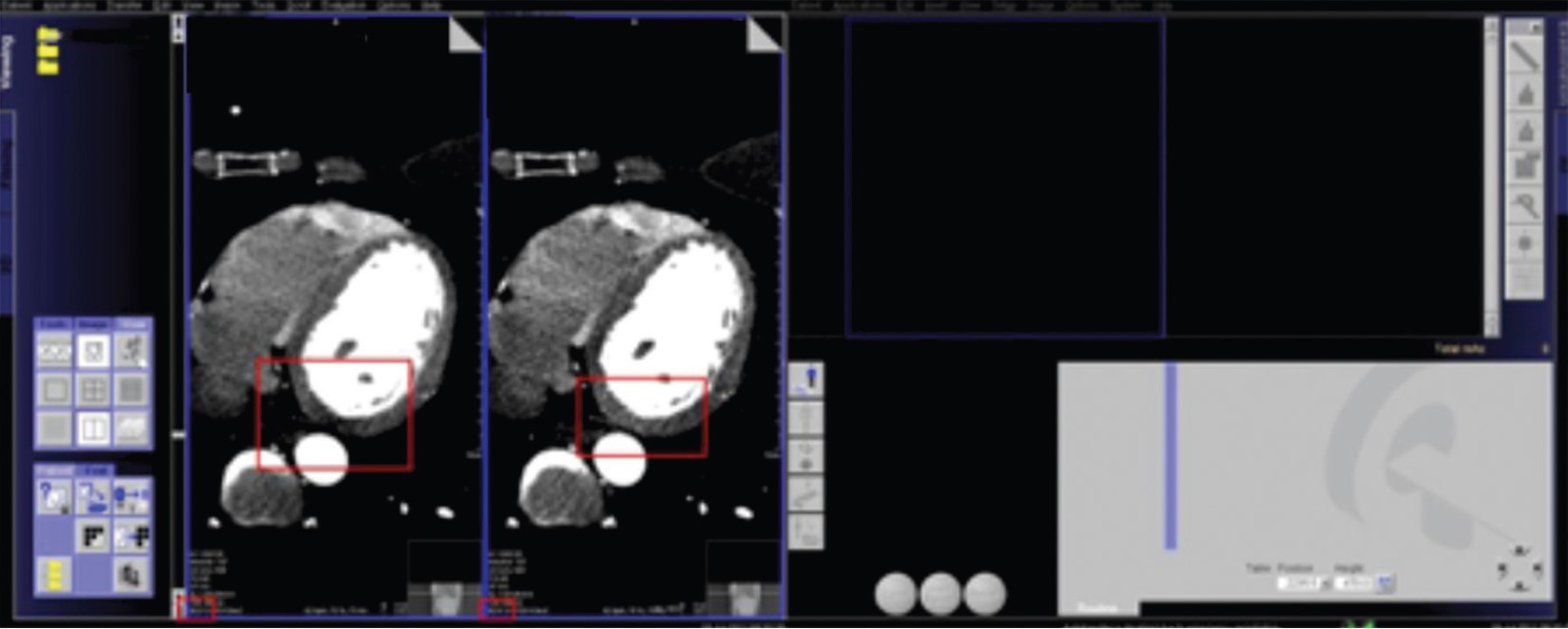 Fig. 2—CT images show beam-hardening correction (left) and utility of B23 kernel (right) as it reduces beam-hardening artifact from iodine in left ventricle and thoracic aorta, affecting posterior inferior aspect of left ventricle wall mimicking infarct.