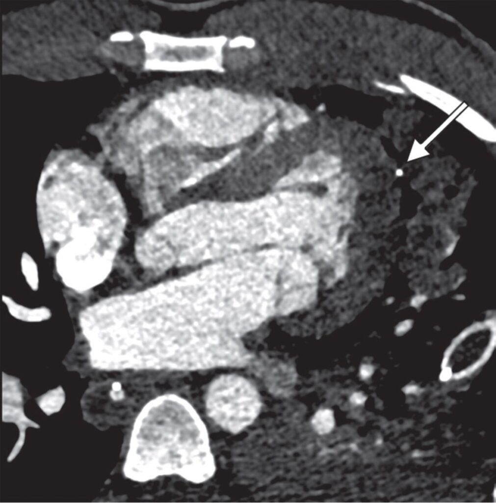 Any pericardial effusion detected in the acute trauma setting is presumed to be hemopericardium until proven otherwise. CT provides valuable information about the possible nature of pericardial effusions on the basis of the attenuation measurements of the collection. Coronary artery injuries are rare (in less than 2% of chest trauma cases), with left anterior descending artery being most commonly injured [4]. Penetrating cardiac trauma can result in pericardial injuries, which can result in partial or complete transdefect cardiac herniation or luxation with mortality up to 70% [5]. Portable supine studies in ED are suboptimal with overlying artifacts, which limits evaluation. TEE is invasive and difficult to perform in patients with acute craniocervical injuries. Cardiac MRI in trauma is primarily useful as a problem-solving tool after patients are admitted, especially to delineate the extent of myocardial contusion, regional infarction, wall motion abnormality, and valvular dysfunction.