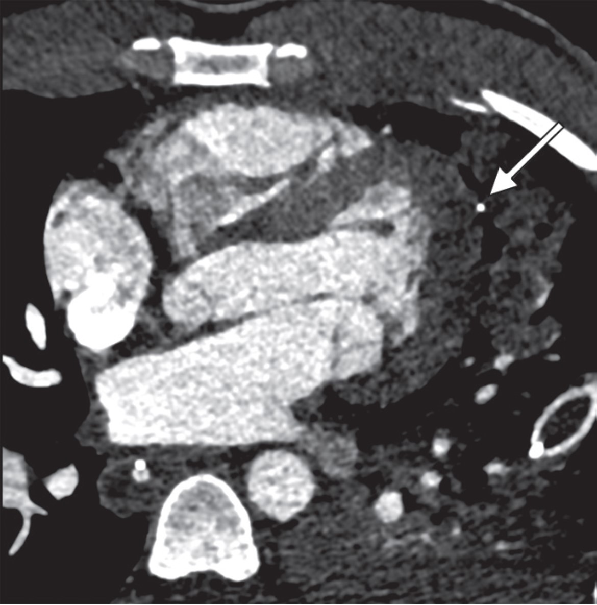 Several steps can be taken to optimize the quality of cardiac CT studies. A heart rate of less than 65 beats/min can be achieved by administering 5–20 mg of β-blocker (metoprolol) IV or 50–100 mg by mouth 1 hour before the CT. Lowering the heart rate widens diastole and decreases beat-to-beat variability. Coronary arterial dilatation for optimal visualization can be achieved by administering 0.4–0.8 mg of nitroglycerin sublingually 5 minutes before contrast injection. Reconstruction algorithms can be used to reduce beam-hardening artifacts from iodine that mimic ischemia (Fig. 2).