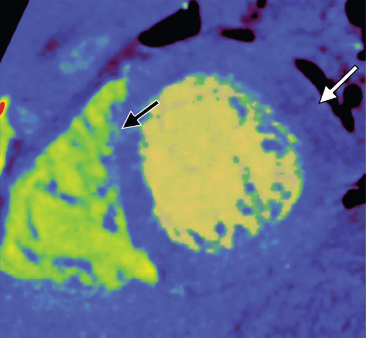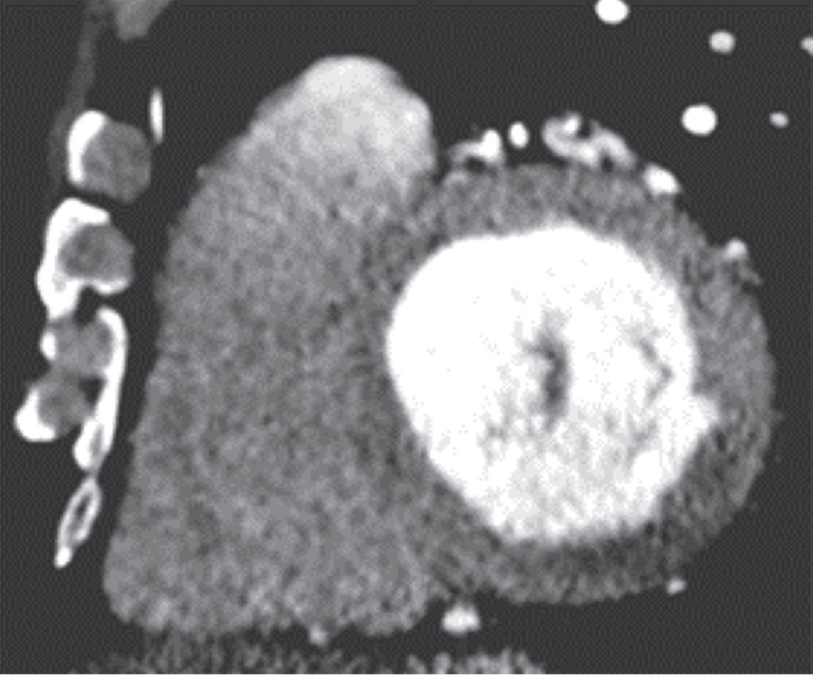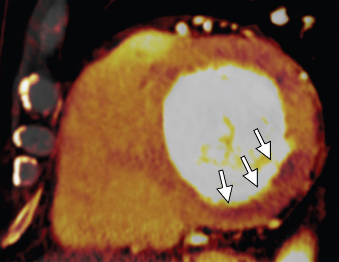 Myocardial perfusion is one of the most important prognostic indicators for patient outcome and management of CAD. CT myocardial blood pool analysis using myocardial iodine content is a promising dynamic technology. DECT color-coded iodine maps permit sensitive detection of myocardial perfusion by depicting myocardial blood pooling [9]. The perfused myocardium takes up iodine, but no iodine uptake is seen in the infarcted myocardium (Fig. 3). Assessment of myocardial viability predicts successful revascularization therapy.