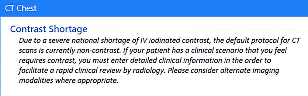 Fig. 1—Screenshot from electronic health record shows sidebar text displayed to referring clinicians after placing orders for body CT (defined as CT of neck, chest, or abdomen and pelvis) that describes iohexol shortage and provides appropriate strategies for iodinated contrast media conservation.