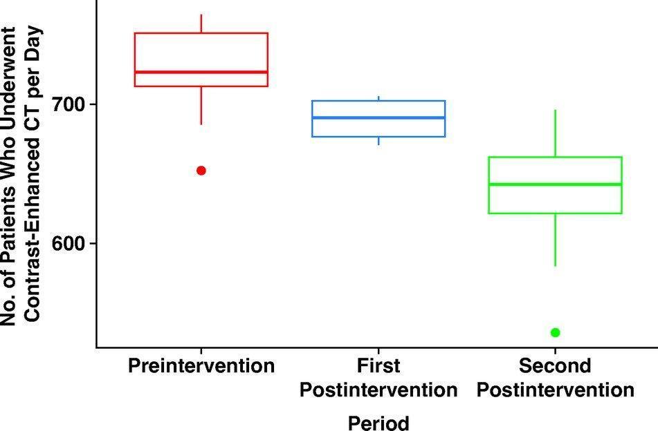 The number of patients undergoing contrast-enhanced CTs per day decreased from 726 prior to the interventions, to 689 after intervention 1, to 639 after intervention 2 (Fig. 2).