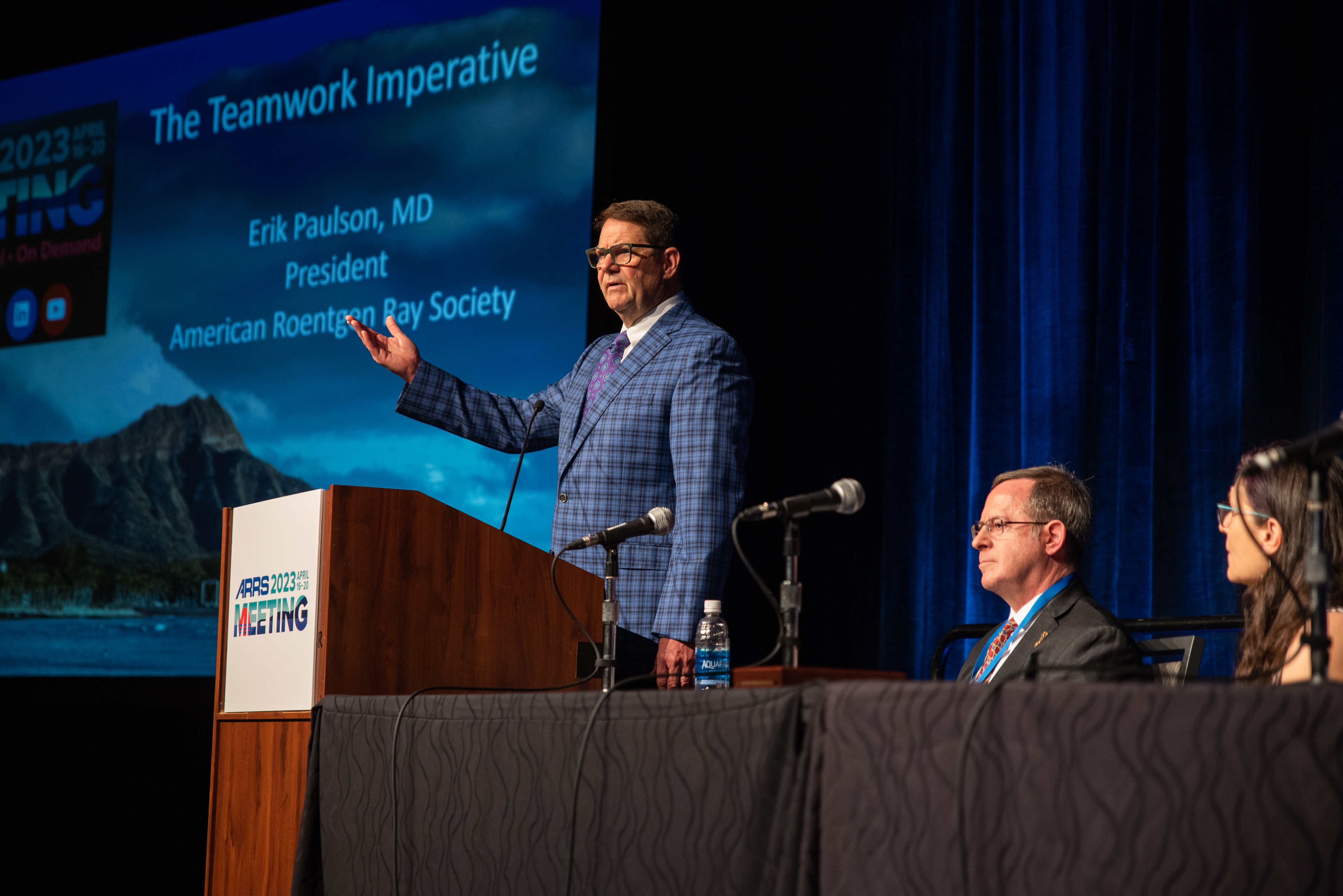 Erik K. Paulson, MD, chair of the radiology department at Duke University, was installed as the 123rd president of ARRS. “I am absolutely honored and delighted to serve as the president of our country’s oldest radiology society, a society whose sweet spot is member education,” Dr. Paulson said during his opening remarks at the Hawaii Convention Center. “It takes a team, though,” he acknowledged. And joining Dr. Paulson are the following newly elected ARRS officers for 2023–2024: Angelisa M. Paladin, President-Elect; Deborah A. Baumgarten, Vice President; and Christine M. Glastonbury, Secretary-Treasurer.