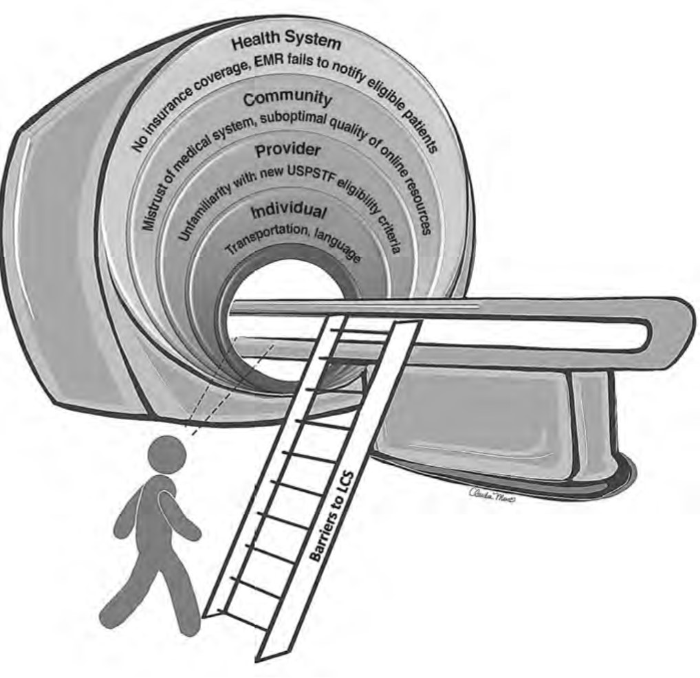 To advance equitable participation in LCS and achieve the population health goal of improving LC outcomes for all patients through early detection, it is paramount that multilevel interventions are tailored to fit the needs and capacities of diverse patient populations served by all types of community practices. To achieve this goal, transdisciplinary system-based programs and interventions are key to address systemic barriers, improve access and uptake of LCS, and improve LC outcomes primarily among underserved patient populations. As radiologists and promoters of the health and well-being of our patients, partnering with patients, community organizations, and other medical specialties to assist patients in overcoming multilevel barriers to LCS will allow us to design sustainable programs to promote awareness of, opportunities for, and participation in LCS for all patients.