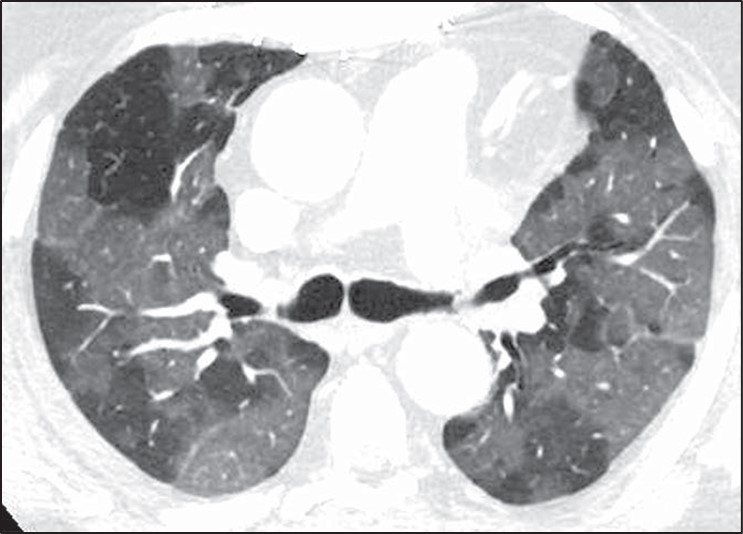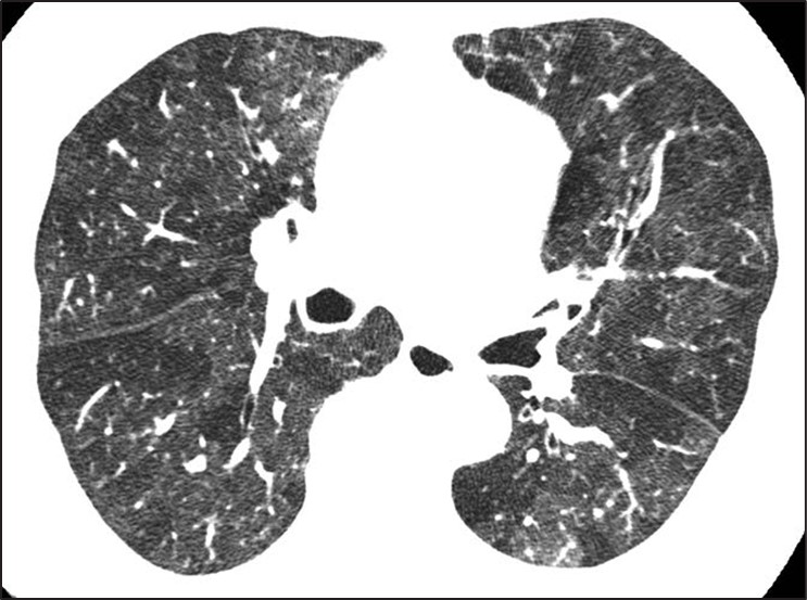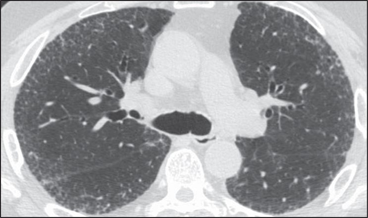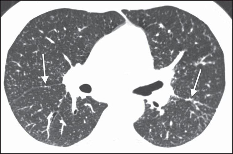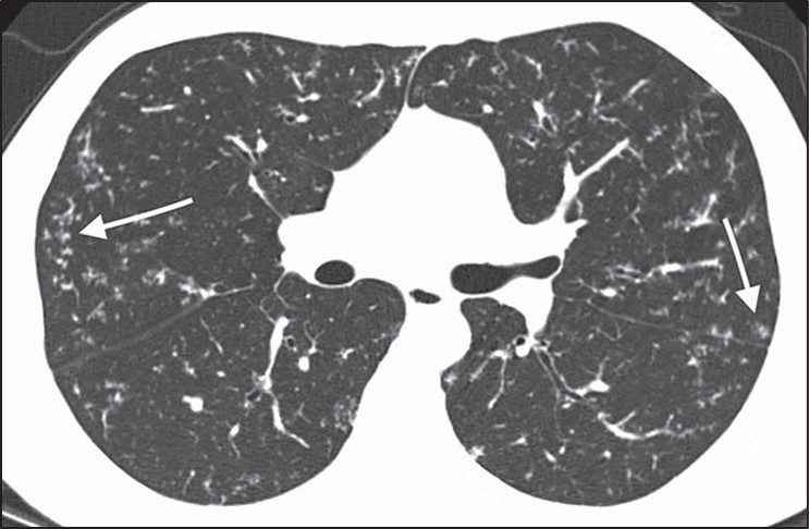 Fig. 11—Axial high-resolution CT scan shows perilymphatic distribution mimicking random nodules. Innumerable tiny nodules are present. Although pattern resembles random distribution, heterogeneous distribution in lung shows proportionally more nodules along fissures (arrows) than would be expected for random distribution.