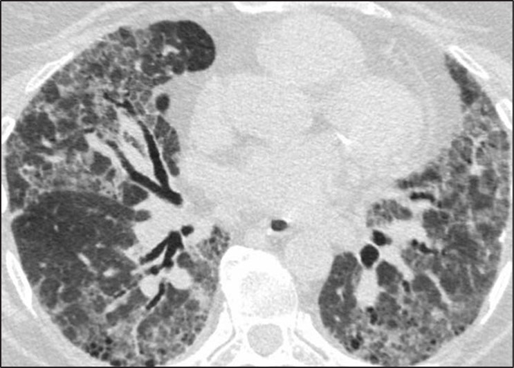 Fig. 1—73-year-old man with idiopathic pulmonary fibrosis. HRCT scan shows usual interstitial pneumonia pattern of fibrosis characterized by subpleural and basal distribution of fibrosis with honeycombing.
