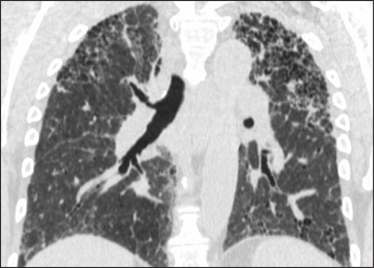 Fig. 5—Fibrosis with honeycombing in atypical distribution. Left, Axial HRCT scan shows diffuse fibrosis in association with ground-glass opacity. Diagnosis was hypersensitivity pneumonitis. Right, Coronal HRCT scan shows upper lobe–predominant fibrosis. Diagnosis was sarcoidosis.