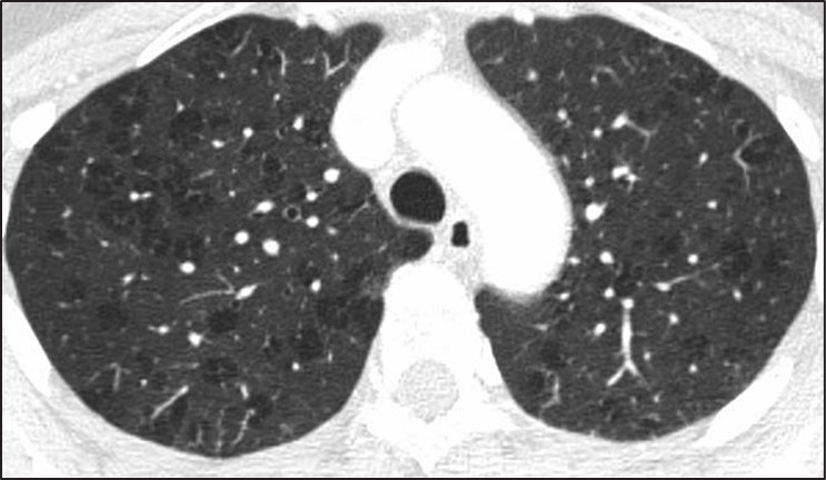 In general, pulmonary cysts are fewer in number, noncentrilobular in distribution, and have thicker or more perceptible walls compared with centrilobular emphysema [16]. Paraseptal emphysema and panlobular emphysema are less frequently mistaken for cystic lung disease because of their strongly subpleural distribution and overall extent respectively.