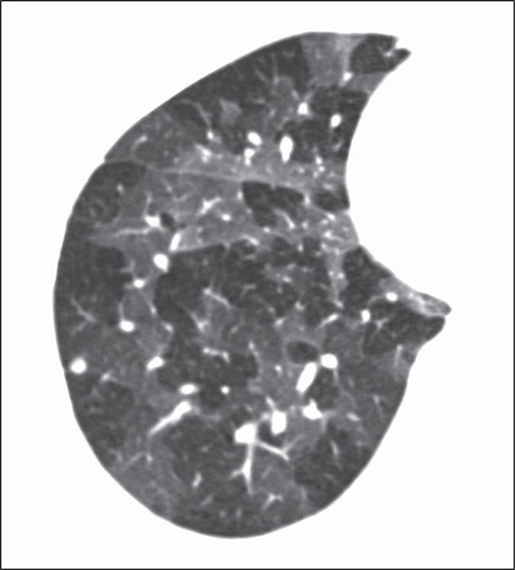 Fig. 3—HRCT scan shows patient with paraseptal emphysema with extensive involvement of subpleural lung, but without well-defined walls or other findings of fibrosis.
