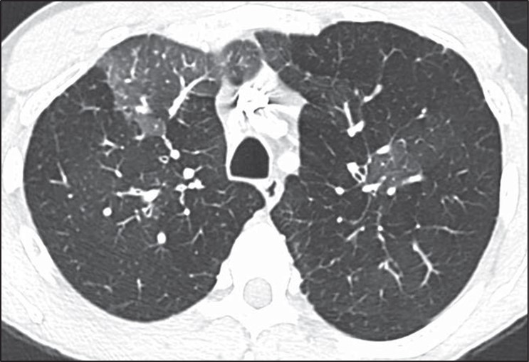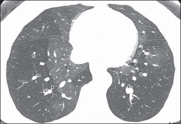 Fig. 6—Axial HRCT scan shows “central dot” sign in patient with centrilobular emphysema.