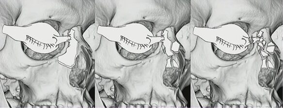 Left: Type I, Intact medial canthal tendon connected to single large fracture fragment; Center: Type II, Intact medial canthal tendon connected to single comminuted fracture fragment; Right: Type III, Disrupted medial canthal tendon with severe comminution about the lacrimal fossa