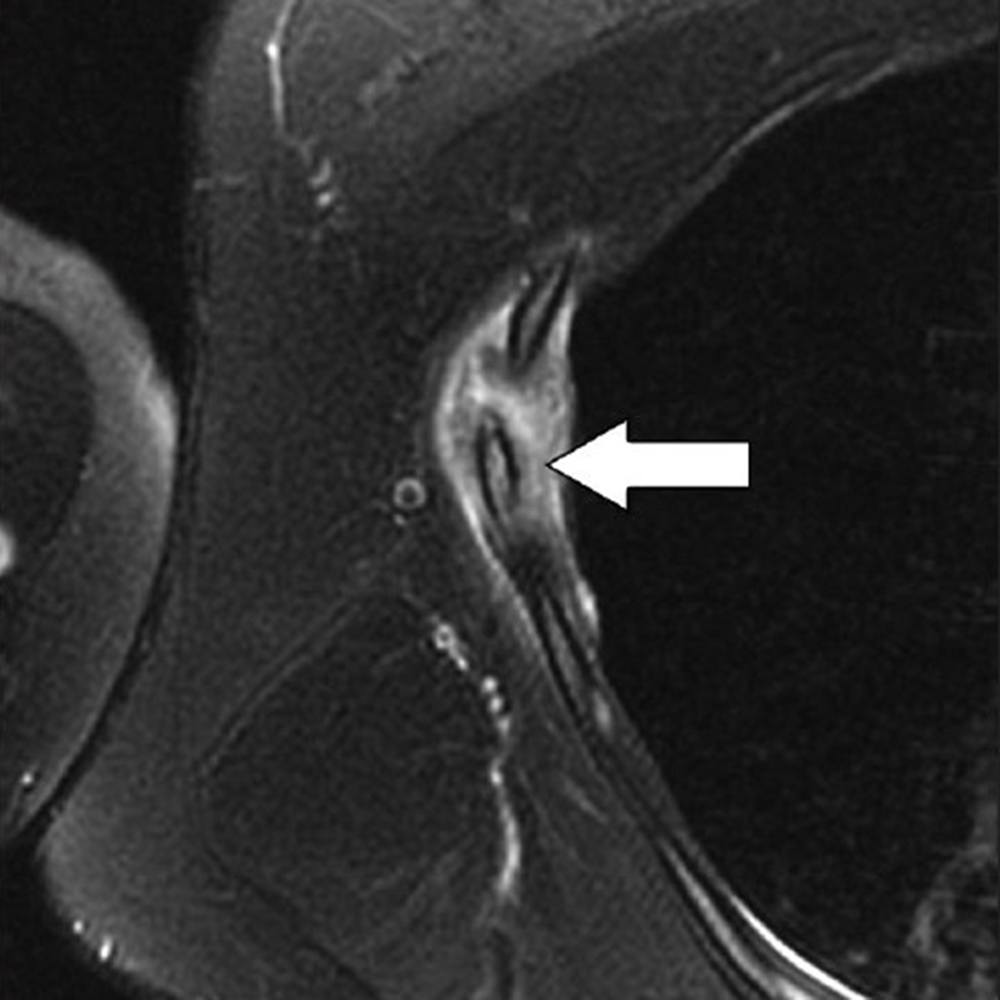 Injuries to the latissimus dorsi and teres major muscles are most commonly seen in throwing athletes [15–18]. The latissimus dorsi muscle has a broad origin that includes, among others, multiple spinous processes of the thoracolumbar region and iliac crest; the muscle then attaches at the floor of the intertubercular groove of the humerus. The teres major muscle originates at the posterior aspect of the inferior angle of the scapula and inserts at the medial ridge of the intertubercular sulcus of the humerus. In cadaver studies, the latissimus dorsi and teres major tendon attachments were seen as a single structure in up to 83% of cases [15–18]. In the remaining cases, separate tendons attaching to the humerus were visible on axial images. One important action of these muscles is to powerfully adduct, extend, and internally rotate the humerus. During the throwing motion, the latissimus dorsi and teres major muscles are activated as a unit, with maximum levels of eccentric contraction during the arm cocking and arm deceleration stages of the throwing cycle [15–18]. Lesions of the latissimus dorsi and teres major may present along the usual spectrum of myotendinous strain injuries up to avulsions at the humeral attachments. For this reason, MRI is the preferred imaging method, as it can characterize the full gamut of possible lesions, including those affecting the more dorsal portions of the latissimus dorsi muscle. In this situation, the location of the patient’s symptoms should be considered to ensure adequate coverage on imaging. Because the latissimus dorsi covers a large area of the lateral and posterior chest wall, large FOVs may be required, especially if bilateral imaging is being performed. Another important technical point is to ensure that axial images through the humerus adequately cover the footprints of latissimus dorsi, teres major, and pectoralis major tendons, which are usually not fully viewed during standard shoulder imaging protocols. This may require obtaining axial images that extend caudally to approximately the middle third of the humerus to guarantee such coverage in all patients. Regarding treatment, avulsions at the humeral attachment, which have been described in athletes involved in waterskiing, golf, tennis, and bodybuilding, usually require surgical intervention to reattach the tendons [18]. On the other hand, most myotendinous lesions of latissimus dorsi and teres major muscles are treated conservatively.