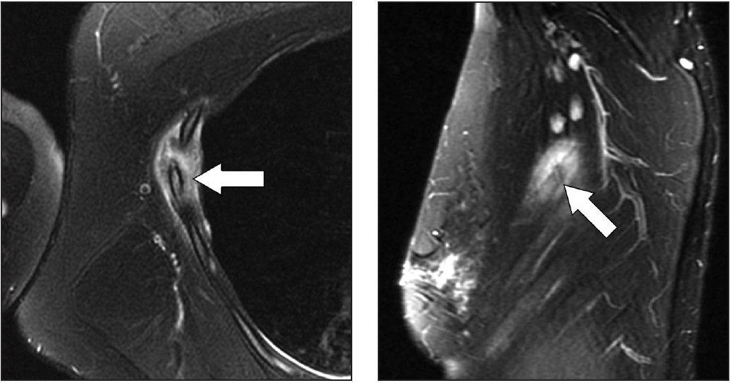Injuries to the latissimus dorsi and teres major muscles are most commonly seen in throwing athletes [15–18]. The latissimus dorsi muscle has a broad origin that includes, among others, multiple spinous processes of the thoracolumbar region and iliac crest; the muscle then attaches at the floor of the intertubercular groove of the humerus. The teres major muscle originates at the posterior aspect of the inferior angle of the scapula and inserts at the medial ridge of the intertubercular sulcus of the humerus. In cadaver studies, the latissimus dorsi and teres major tendon attachments were seen as a single structure in up to 83% of cases [15–18]. In the remaining cases, separate tendons attaching to the humerus were visible on axial images. One important action of these muscles is to powerfully adduct, extend, and internally rotate the humerus. During the throwing motion, the latissimus dorsi and teres major muscles are activated as a unit, with maximum levels of eccentric contraction during the arm cocking and arm deceleration stages of the throwing cycle [15–18]. Lesions of the latissimus dorsi and teres major may present along the usual spectrum of myotendinous strain injuries up to avulsions at the humeral attachments. For this reason, MRI is the preferred imaging method, as it can characterize the full gamut of possible lesions, including those affecting the more dorsal portions of the latissimus dorsi muscle. In this situation, the location of the patient’s symptoms should be considered to ensure adequate coverage on imaging. Because the latissimus dorsi covers a large area of the lateral and posterior chest wall, large FOVs may be required, especially if bilateral imaging is being performed. Another important technical point is to ensure that axial images through the humerus adequately cover the footprints of latissimus dorsi, teres major, and pectoralis major tendons, which are usually not fully viewed during standard shoulder imaging protocols. This may require obtaining axial images that extend caudally to approximately the middle third of the humerus to guarantee such coverage in all patients. Regarding treatment, avulsions at the humeral attachment, which have been described in athletes involved in waterskiing, golf, tennis, and bodybuilding, usually require surgical intervention to reattach the tendons [18]. On the other hand, most myotendinous lesions of latissimus dorsi and teres major muscles are treated conservatively.