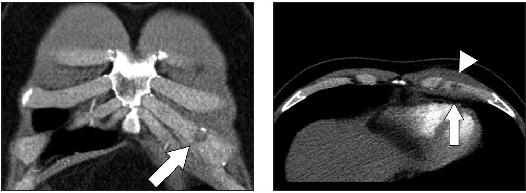 Areas that may be affected by costal cartilage injury include the sternochondral junction, midsubstance of the costal cartilage, and costochondral junction. Most commonly, such injuries affect the relatively immobile upper rib cage (first to third costal cartilages) and are due to rotation injury and/or excessive axial loading (such as in weightlifting). Lesions affecting the lower rib cage (fourth through eighth costal cartilages) typically result from direct impacts, such as seen in contact sports (hockey, football, rugby, and martial arts) [8]. An important anatomic feature of costal cartilage is the presence of a central cavity that is best seen on CT images as a zone of lower attenuation tracking along the structure [9]. A predominance of blood vessels, loose connective tissue, macrophages, and fat exist within this area. Although this zone resembles a bone marrow cavity, no marrow cells or lineage is present. Anatomic studies suggest this central channel in costal cartilage is more akin to nutrient channels because of the dominant feature of high vascularity. The presence of a dense vascular network in this portion of costal cartilage predisposes to significant bleeding in the event of fractures. A common feature in costal cartilage fractures is the presence of an associated hematoma of the chest wall, which can lead to clinician suspicion of neoplastic masses. Scrutiny of the area using thin-slice CT may reveal a linear discontinuity of the costal cartilage adjacent to the suspected mass, increasing the likelihood of a trauma-related cause. Patient history may help direct the radiologist, as a traumatic event related to lifting or direct impact may have occurred, possibly resulting in subsequent pain and a local mass (Fig. 2).