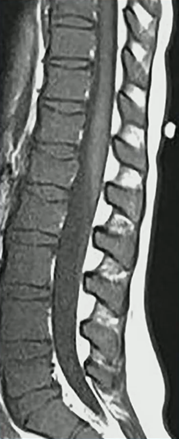 - The Dropout Test: In this patient, while fat is clearly visible in the subcutaneous and epidural spaces, there is a complete absence of fat signal within the bone marrow.