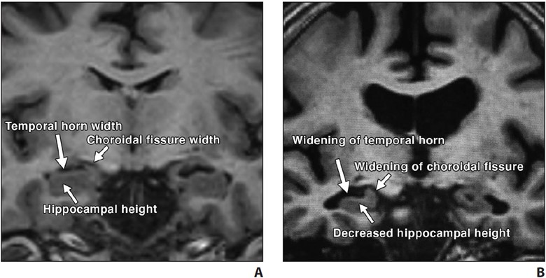 In typical AD, there is involvement of the medial temporal lobe and lateral temporoparietal cortex, precuneus, and lateral frontal lobe, which is manifested by loss of volume and hypometabolism [16]. The Scheltens scale is widely used for visual rating of hippocampal volume loss [17] (Fig. 2).