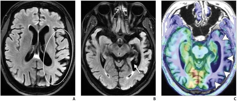 A–C, Axial FLAIR (A and B) and axial arterial spin-labeling (ASL) (C) MR images of patient with impaired word retrieval and repetition show left inferior parietal and superior temporal region atrophy, suggested by asymmetric sulcal widening on FLAIR MR image (oval, A) compared with that seen on ASL image (C). Left temporal atrophy was also suggested by asymmetric widening of left temporal horn (arrow, B). Hypoperfusion in involved regions (arrowheads, C) is likely due to underlying hypometabolism.