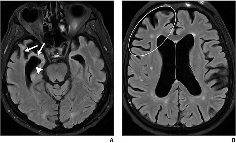 A and B, Axial FLAIR MR images of patient with personality changes show markedly asymmetric right temporal lobe and mildly asymmetric right frontal lobe atrophy. Note thinning of right temporal lobe gyri (arrows, A) and asymmetric dilatation of right temporal horn (arrowhead, A). Note asymmetric prominence of right frontal lobe sulci (oval, B) compared with left frontal lobe sulci.