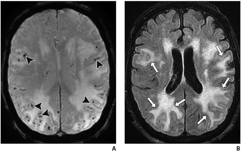 A and B, Axial susceptibility-weighted (A) and FLAIR (B) MR images in patient presenting with progressive cognitive decline. Numerous widespread foci of chronic microhemorrhage (arrowheads, A) are associated with confluent areas of vasogenic edema (arrows, B) suggesting inflammatory cerebral amyloid angiopathy. Areas of edema resolved with steroid therapy.