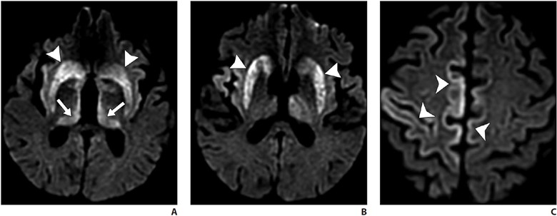 A–C, Axial diffusion-weighted MR images of patient presenting with rapidly progressive cognitive decline show signal abnormality in bilateral corpus striatum (arrowheads, A and B), thalamic pulvinar (arrows, A) and scattered cortical gyriform reduced diffusion (arrowheads, C). Hockey-stick configuration of dorsomedial and pulvinar involvement is commonly described with Creutzfeldt-Jakob disease.