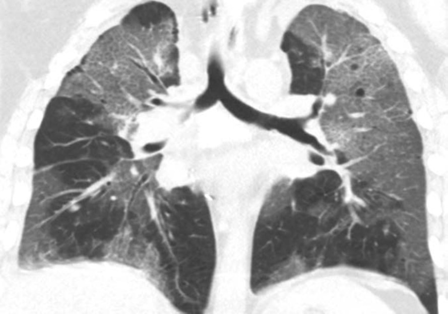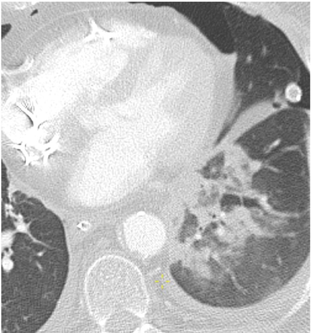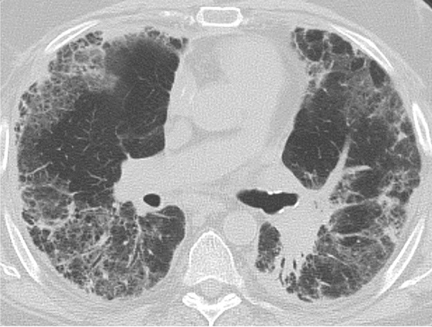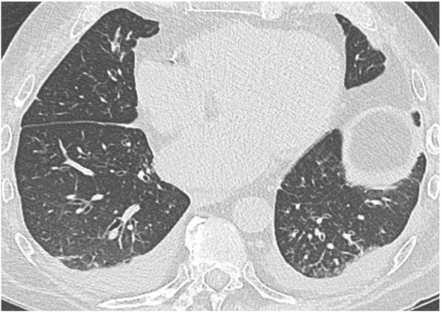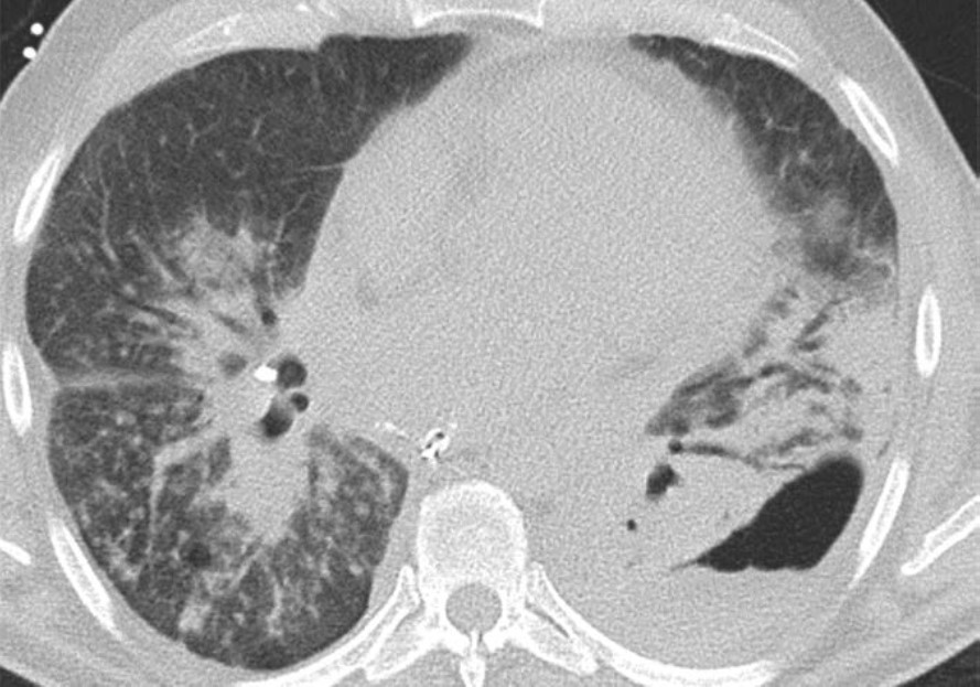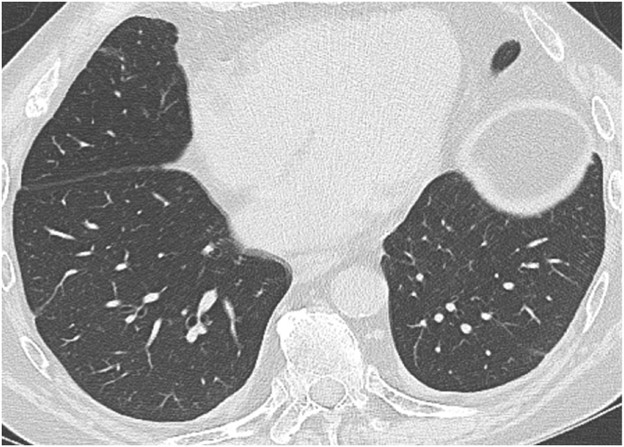 Acute rejection can occur anytime after lung transplant. It consists of two types, acute cellular rejection (ACR) and antibody-mediated rejection (AMR), which can coexist. ACR is the more common of the two types and occurs when recipient T lymphocytes attack donor antigens within the lung allograft. Approximately 35% of lung transplant recipients experience at least one episode of ACR during the 1st year after transplant [2]. During these episodes, patients may be asymptomatic or may present with nonspecific symptoms such as dyspnea and cough. The imaging findings of ACR are nonspecific and include consolidation, ground-glass opacities, and septal-line thickening; as with hyperacute rejection, ACR resembles pulmonary edema. Given its nonspecific clinical and imaging manifestations, ACR requires transbronchial biopsy and tissue analysis for diagnosis. Timely treatment, typically by increased immunosuppression with steroids, is important because ACR is the greatest risk factor for chronic lung allograft dysfunction [4]. Figure 1 shows a patient with biopsy-proven ACR.