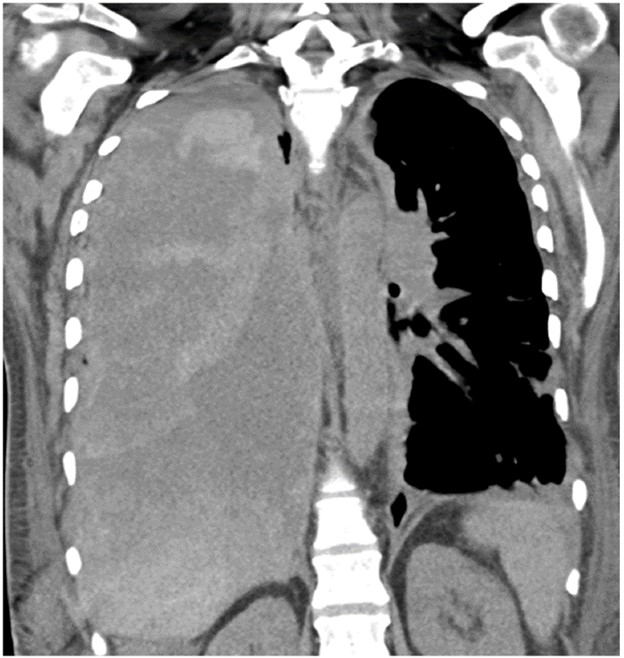 CT of the chest is performed if a more detailed assessment of the chest is required. Example scenarios in which a detailed assessment may be necessary include if there is concern for bronchopleural fistula in the setting of a persistent pneumothorax, if a pulmonary embolism (PE) is suspected due to new-onset tachycardia, and if a patient with decreasing hemoglobin values must be evaluated for hemorrhage. A noncontrast chest CT examination is sufficient for evaluation of the lung parenchyma, airways,
