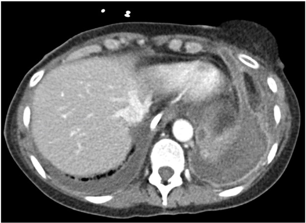 Hemothorax, the presence of blood products in the pleural space, should be suspected if there is rapid increase in the volume of pleural fluid over serial imaging or if pleural fluid is hyperattenuating relative to simple fluid on CT. Hemothorax can be heterogeneous in attenuation on CT due to mixing or layering of new blood products with old blood products; a fluid-fluid level may be present. Figure 5 (left) shows a patient with hemothorax.