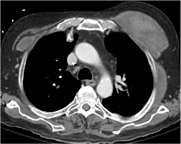 Fig. 6—Patient with history of bilateral lung transplant who developed deep venous thrombosis in early postoperative setting was prescribed anticoagulation therapy and then spontaneously developed chest-wall hematomas, left greater than right. CT image shows heterogeneous-attenuation collections in right and left chest walls deep to pectoralis major muscles, which represent hematomas.