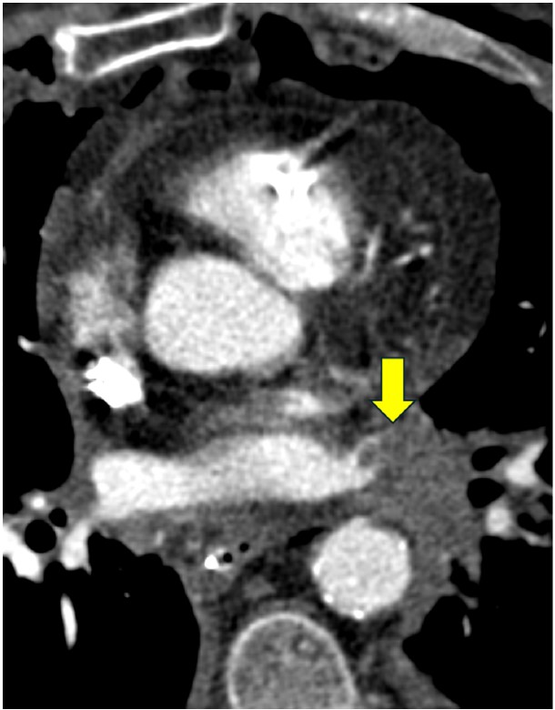 The pulmonary venous anastomosis is created adjacent to the left atrium. Stenosis of the pulmonary venous anastomosis is rare compared with stenosis of the pulmonary arterial anastomosis. On imaging, stenosis manifests as a focal narrowing of the pulmonary vein anastomosis that may or may not be accompanied by findings of venous ischemia and infarction in the lung parenchyma drained by the affected pulmonary vein, such as consolidation, ground-glass opacities, and septal-line thickening. As with pulmonary vein thrombosis, treatment options include endovascular intervention and, in severe cases, surgical repair. Figure 7 (right) shows a patient with pulmonary venous anastomotic stenosis.
