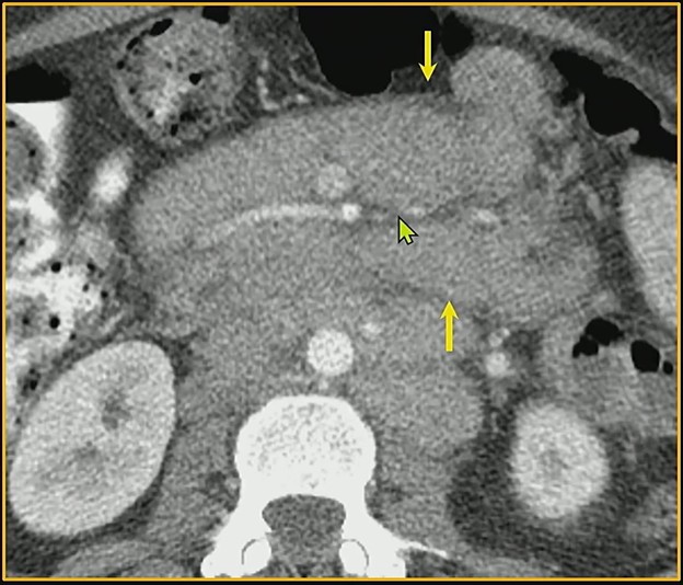 Bread & Butter Tip: The “sandwich sign“occurs when mesenteric masses involve both leaves of the mesentery while relatively preserving the central fat and vasculature. This creates a layered appearance, kinda resembling a sammy.
