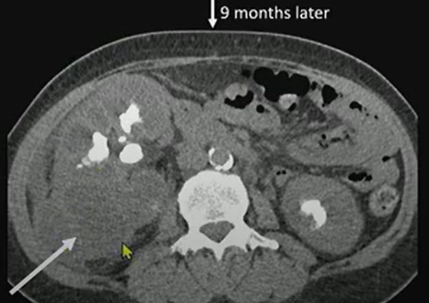 Nine months later, we see much more exuberant inflammation—soft-tissue thickening extending out from the kidney into the retroperitoneum.