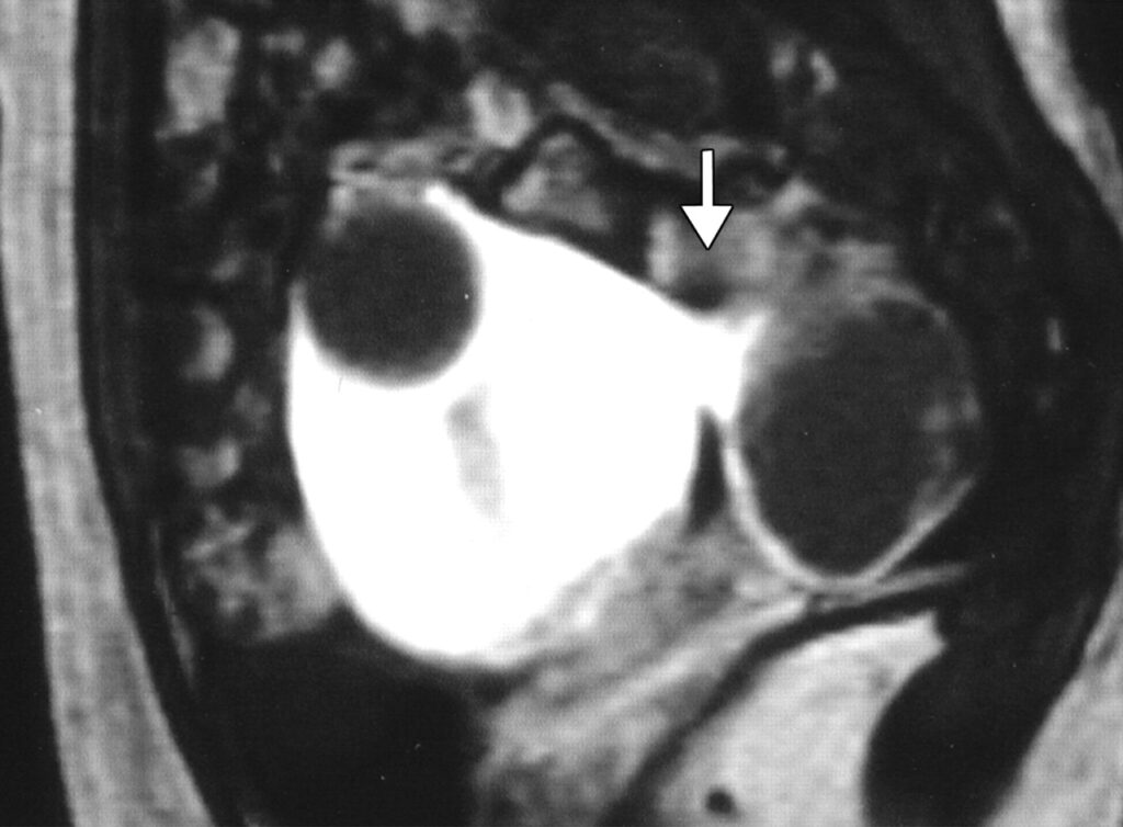 Fig. 2—44-year- old woman with menorrhagia and bulk-related symptoms caused by multiple uterine fibroids. Contrast-enhanced T1-weighted MR image obtained 1 year after embolization reveals pedunculated subserosal fibroid, now 4.5 cm in maximal diameter, is not enhancing. Diameter of stalk (arrow) is now 1.1 cm. Rate of volume reduction in pedunculated subserosal fibroid is 61%. Menorrhagia and bulk-related symptoms markedly improved.