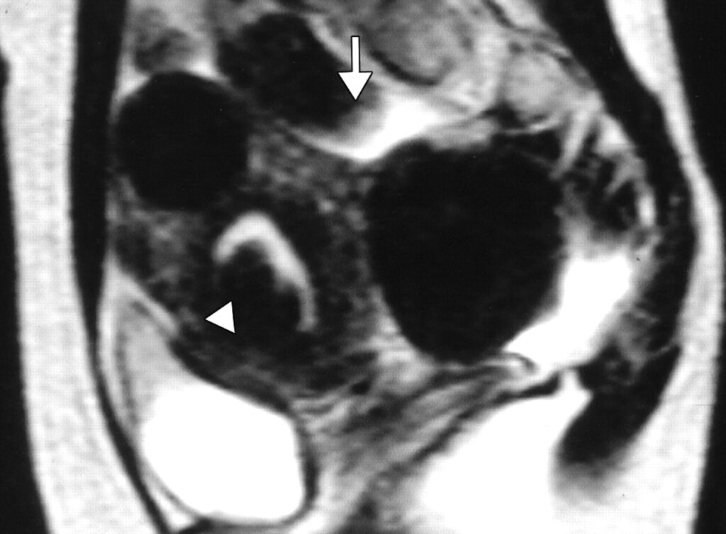Fig. 1—44-year- old woman with menorrhagia and bulk-related symptoms caused by multiple uterine fibroids. T2-weighted MR image obtained before embolization reveals submucosal fibroid (arrowhead) and pedunculated subserosal fibroid 6 cm in maximal diameter. Diameter of stalk (arrow) is 2 cm.