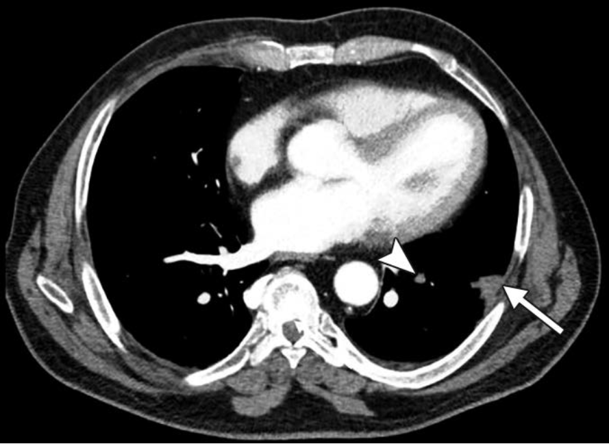 Standard Blended—We see the “What.” A classic peripheral wedge-shaped opacity: Hampton Hump (solid arrow). There is a subtle luminal filling defect in the feeding vessel (arrowhead), but in a motion-degraded scan, you might doubt it.